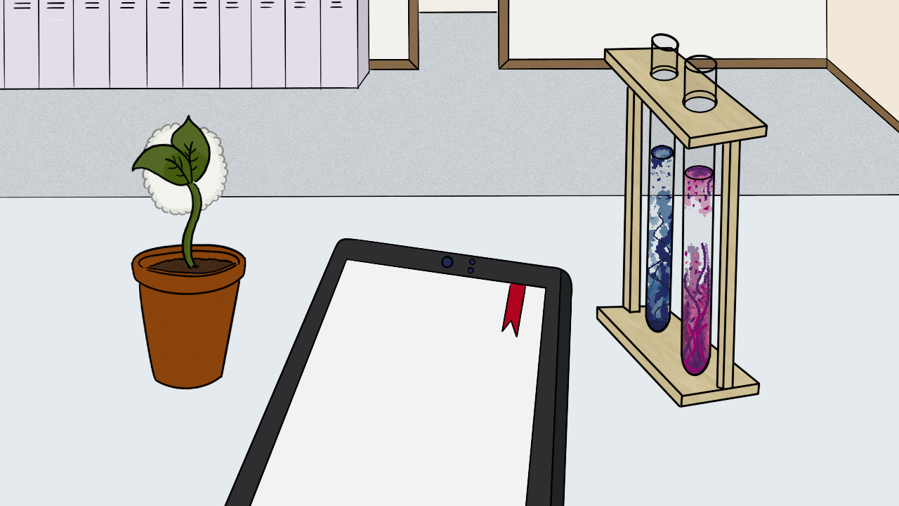 - Seen on the picture: a cotton plant pot, representing the classic experiment of growing a bean on a cotton ball, and on the test tubes, a chemical garden.