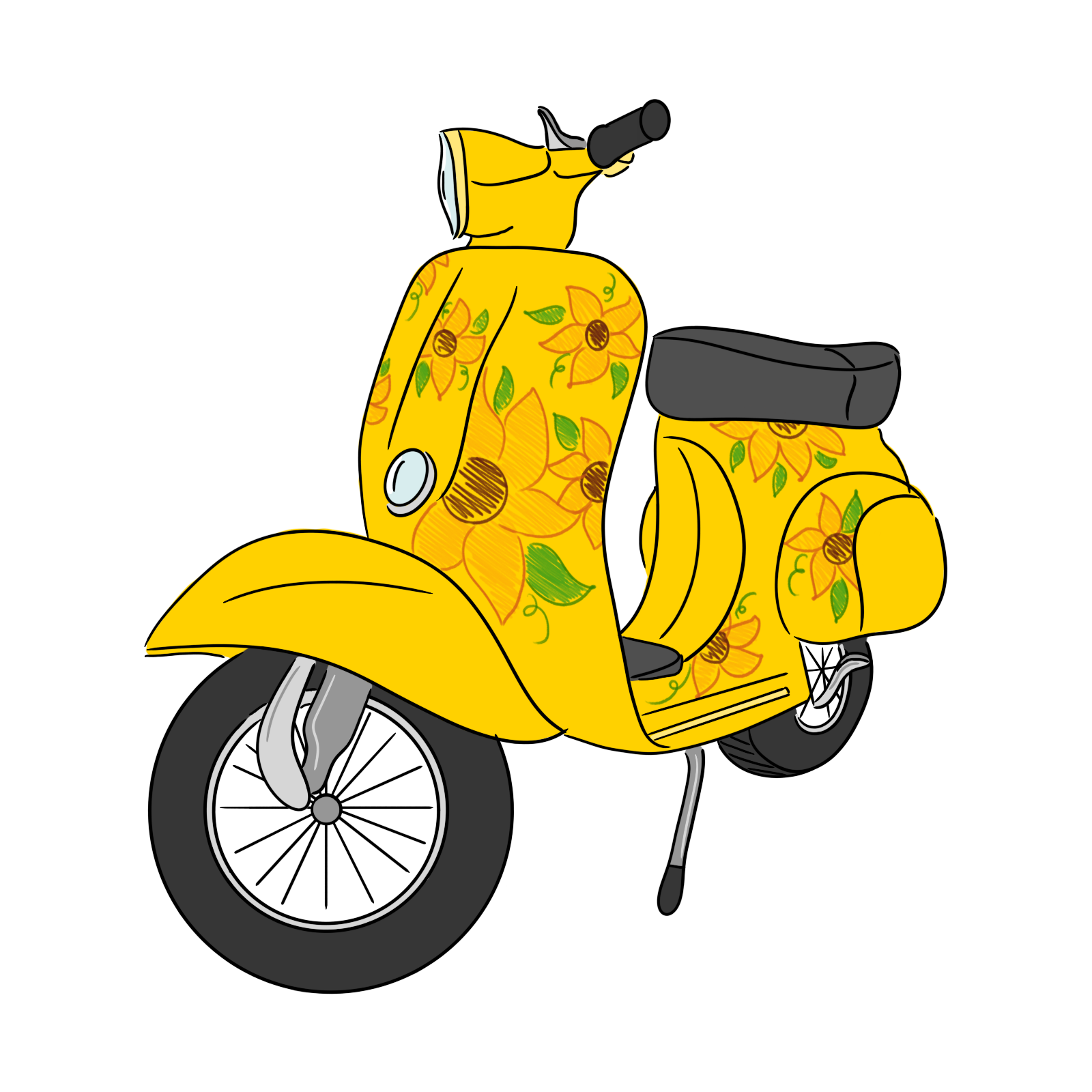The model is near to a Vespa Primavera 125, from 1976. It has a vibrant yellow color, and Jackie decorates it with sunflowers, hence the name.